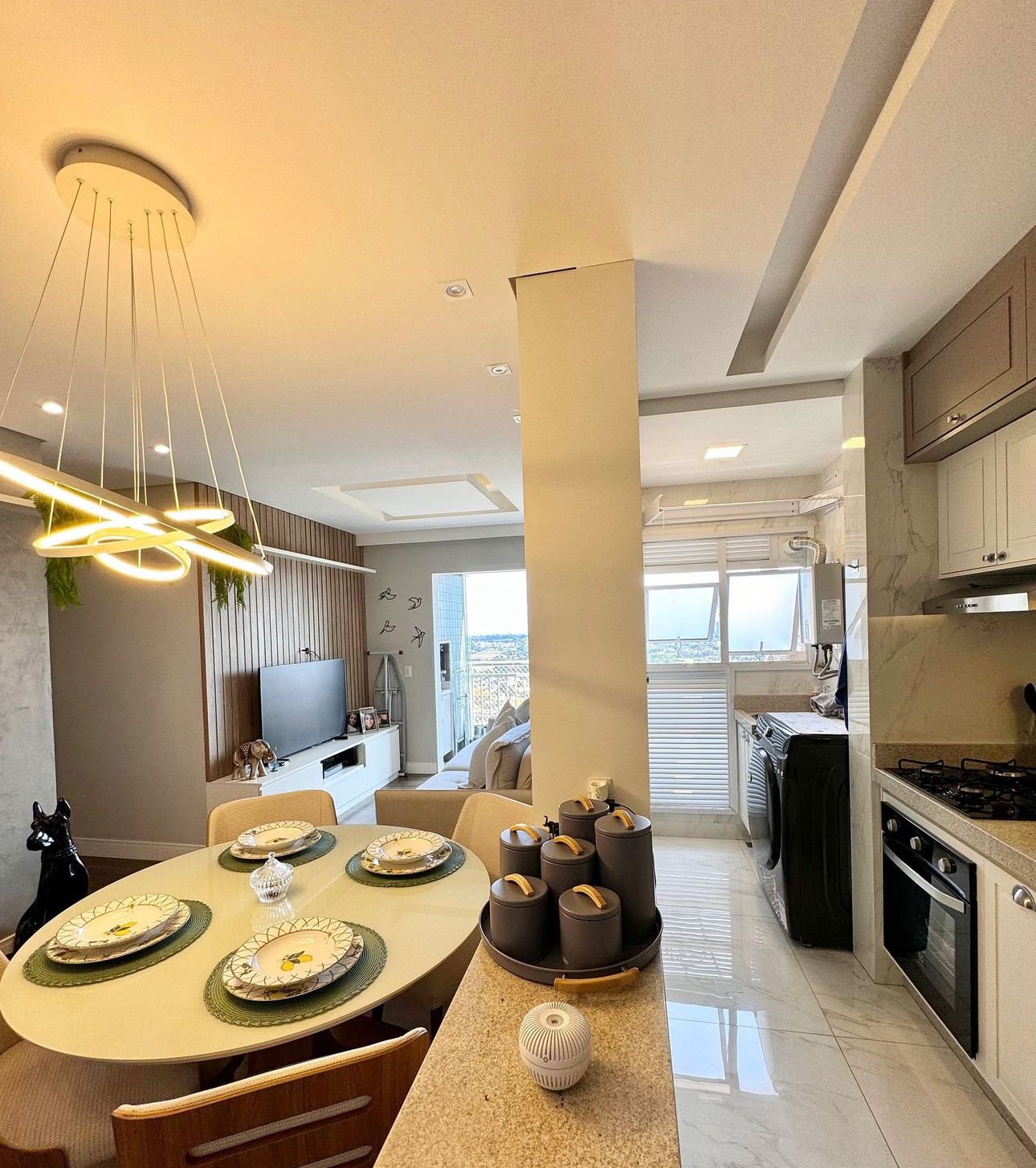 Living Elegante: Sala de TV com painel ripado em madeira e rack suspenso, integrada à sala de jantar com iluminação em LED e pendente moderno. O teto conta com rebaixamento em gesso e iluminação embutida (spots), criando um cenário aconchegante.