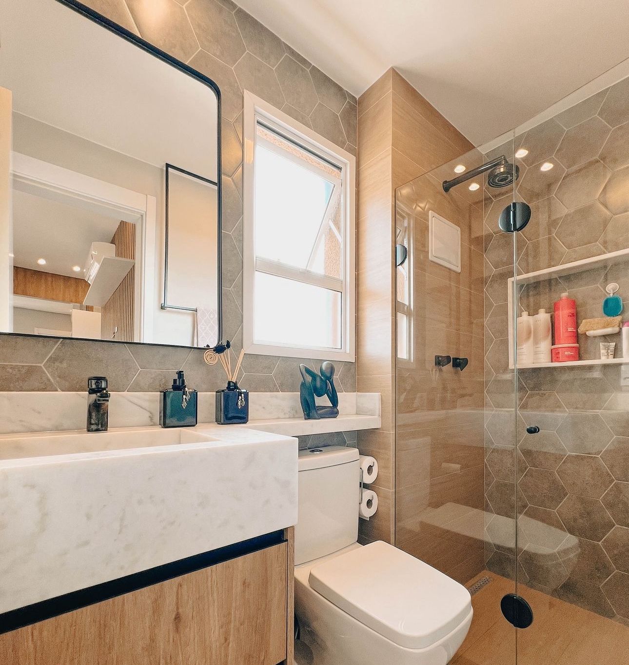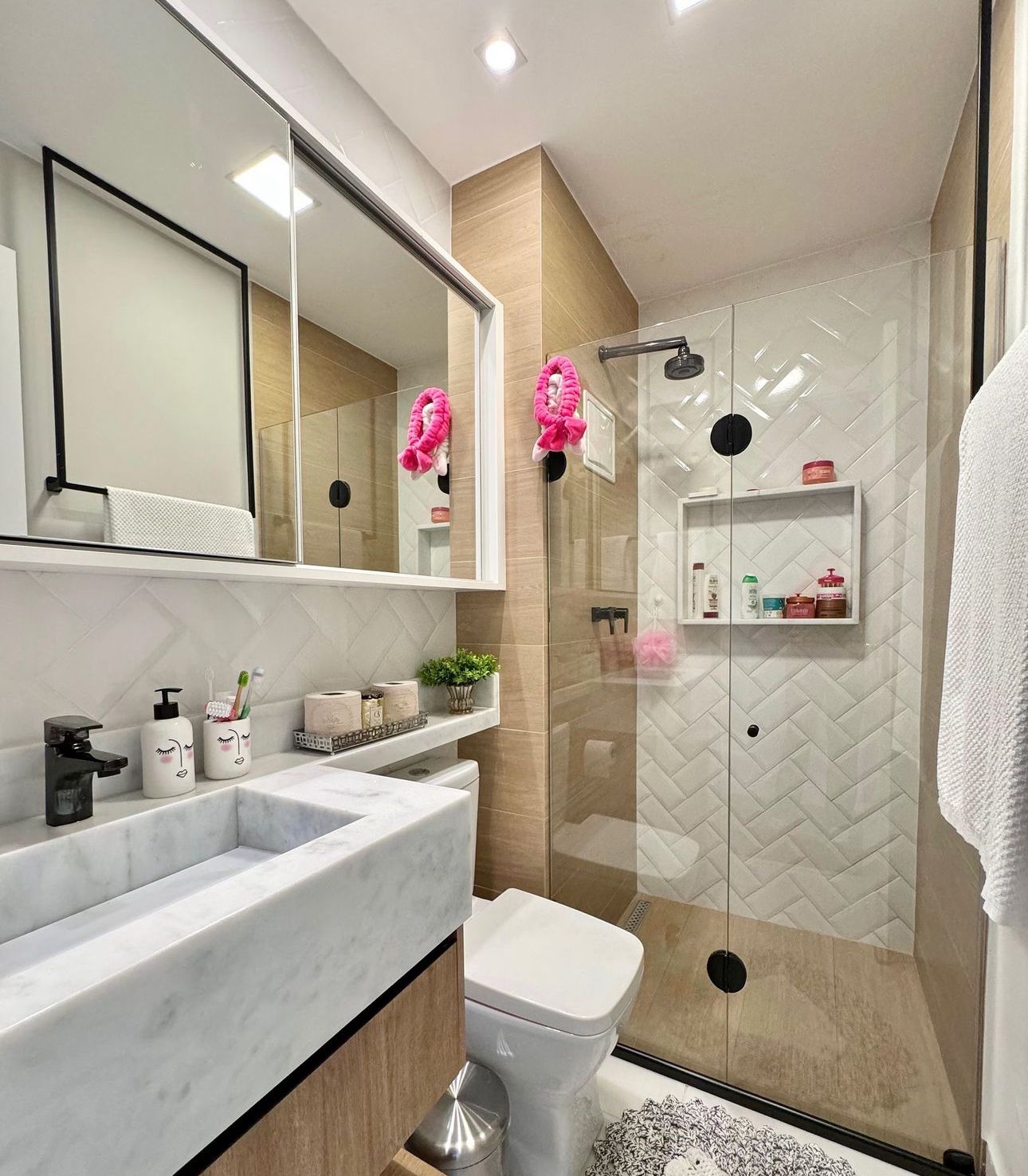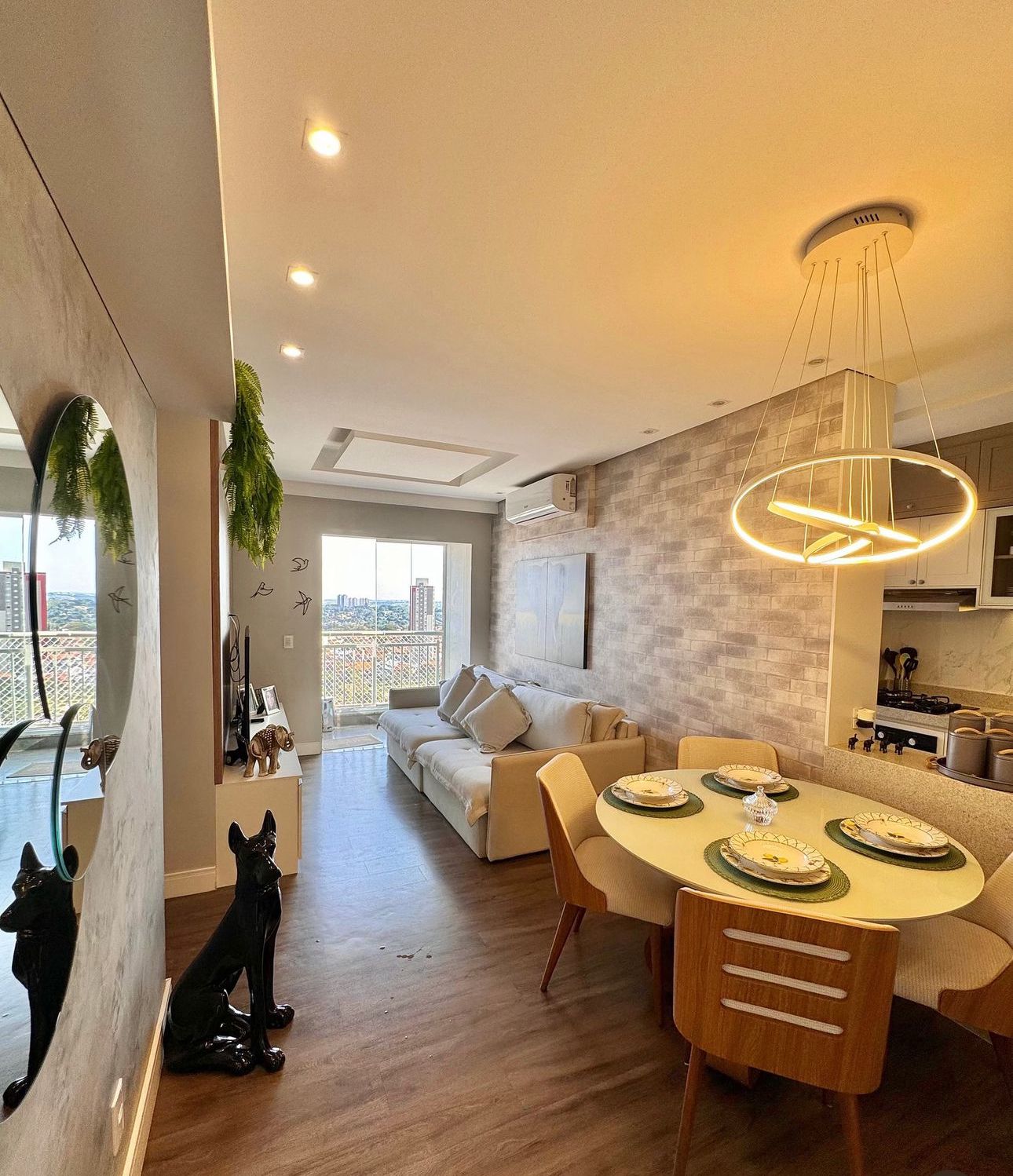 Acabamentos Premium: Parede com revestimento que remete ao tijolinho aparente em tons neutros, trazendo um ar urbano e sofisticado (estilo industrial chic).