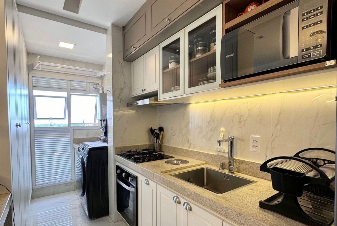 Dormitórios (2 Quartos / 1 Suíte): Ambientes otimizados com marcenaria completa e inteligente, proporcionando organização e elegância.
