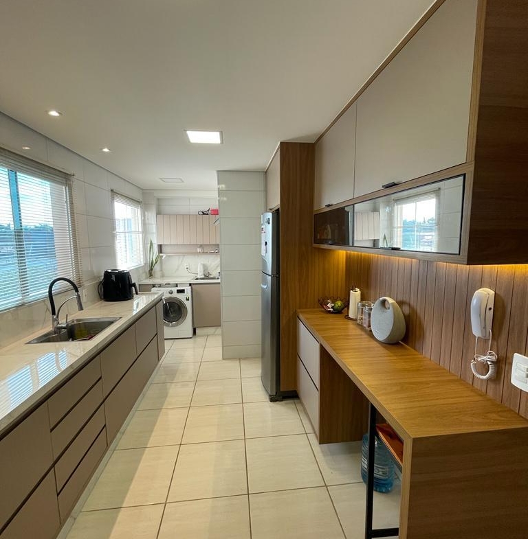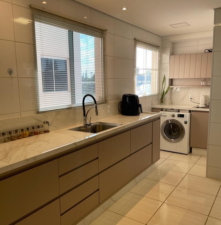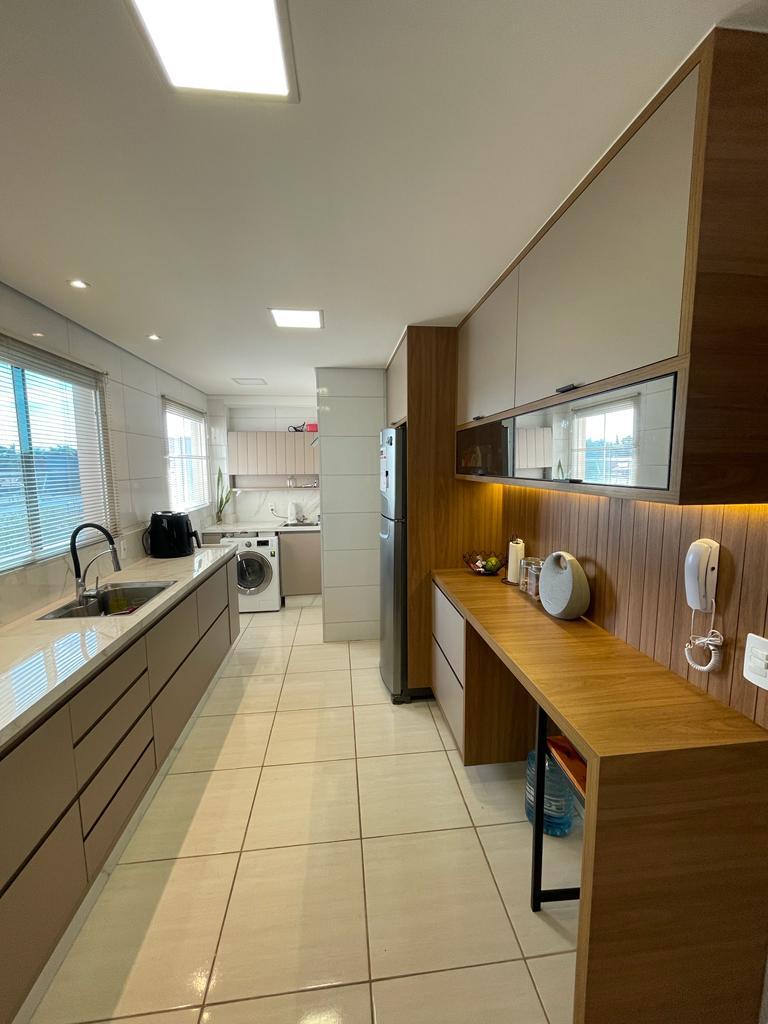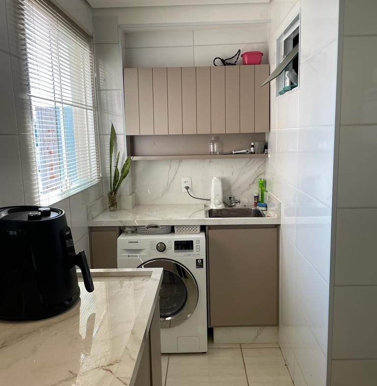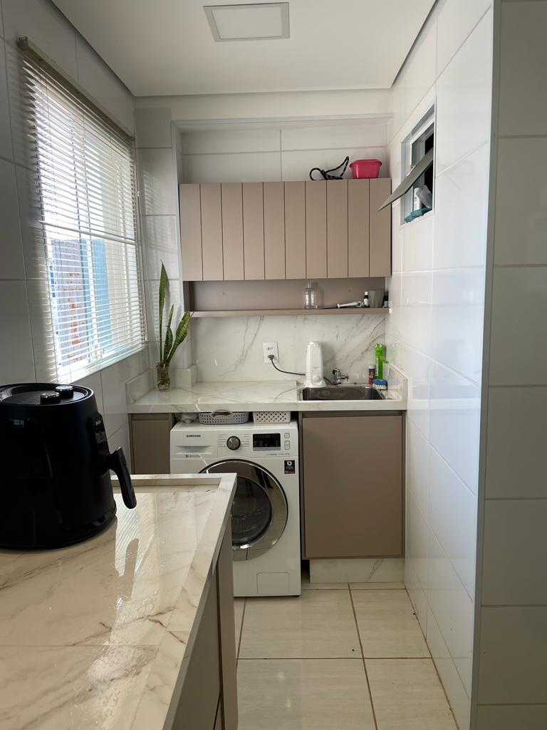 - Cozinha Sofisticada: Armários planejados em tons neutros, bancada em mármore claro (ou similar) e espaço dedicado para eletrodomésticos, como máquina de lavar, otimizando o espaço.