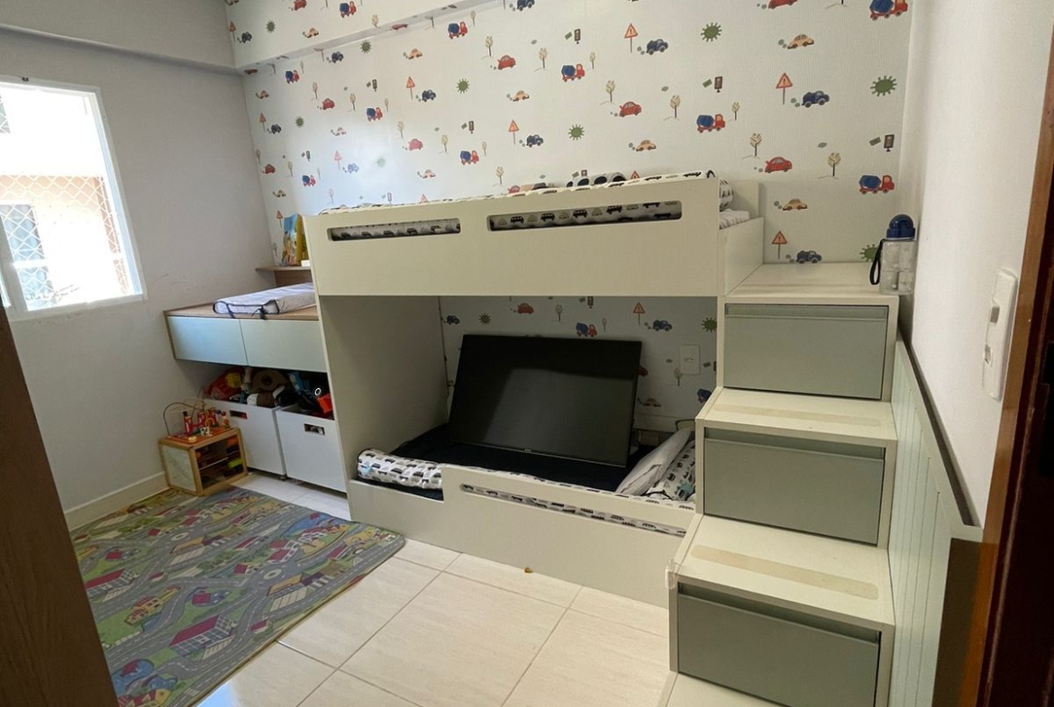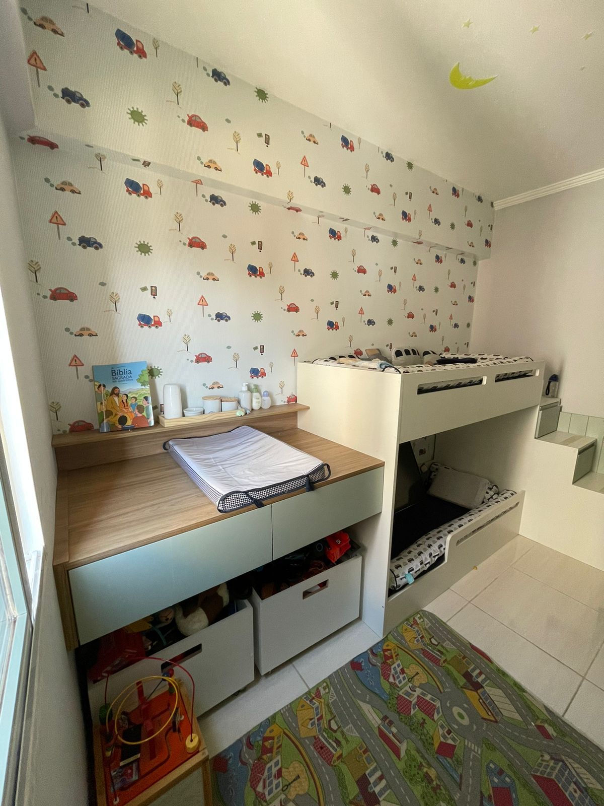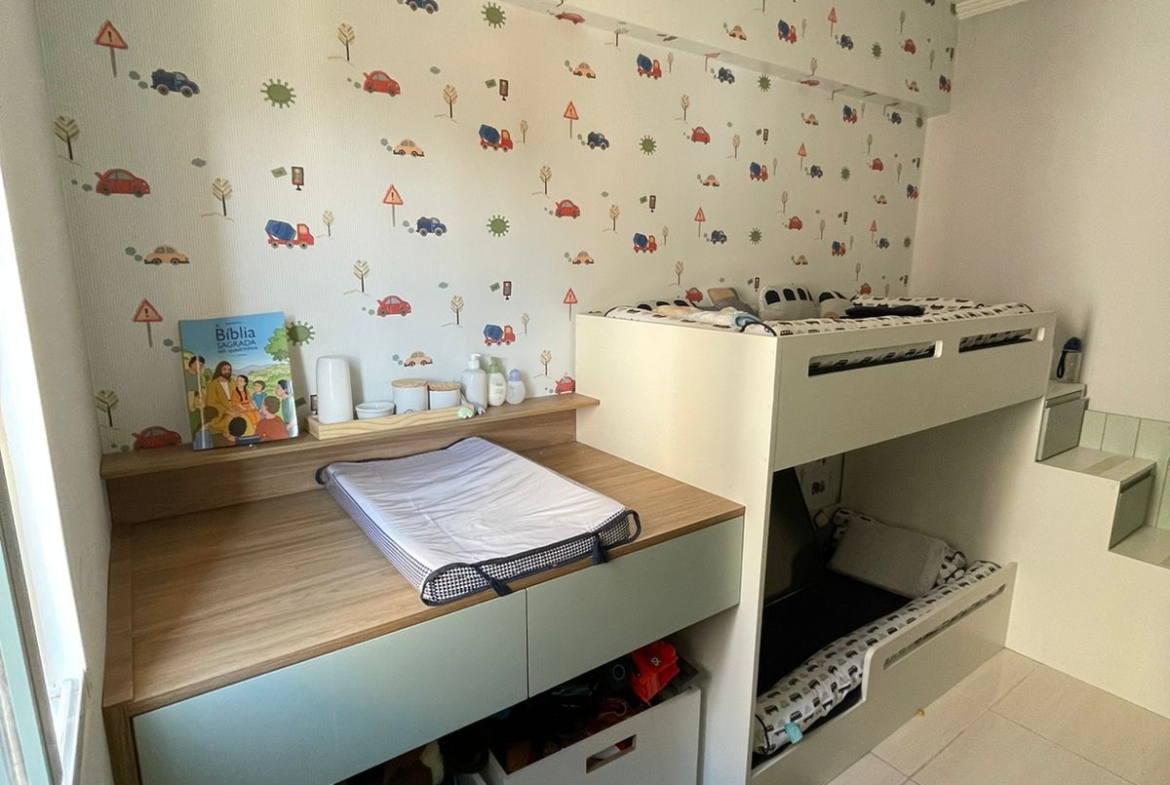 - Dormitório: Projetados com armários e painéis (quarto infantil com beliche planejado, trocador e papel de parede lúdico).