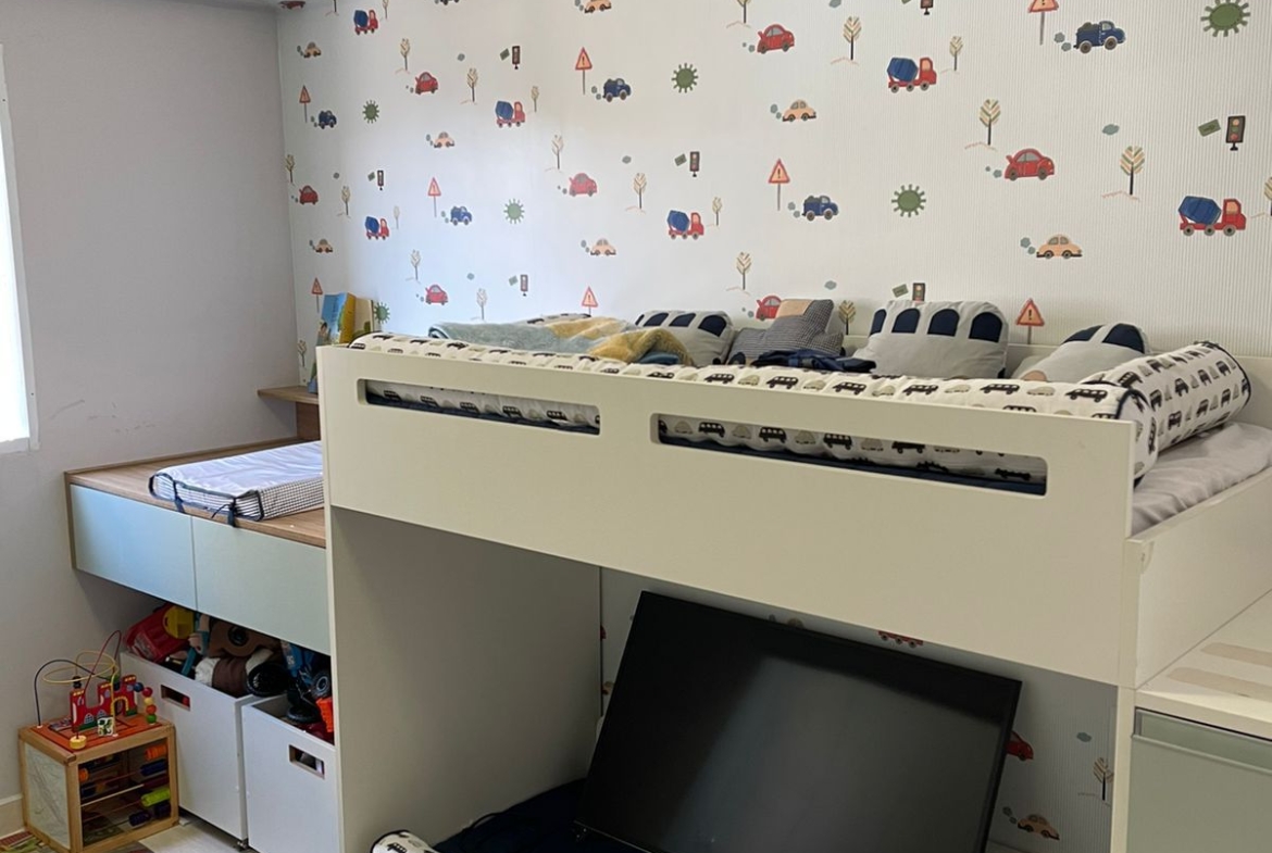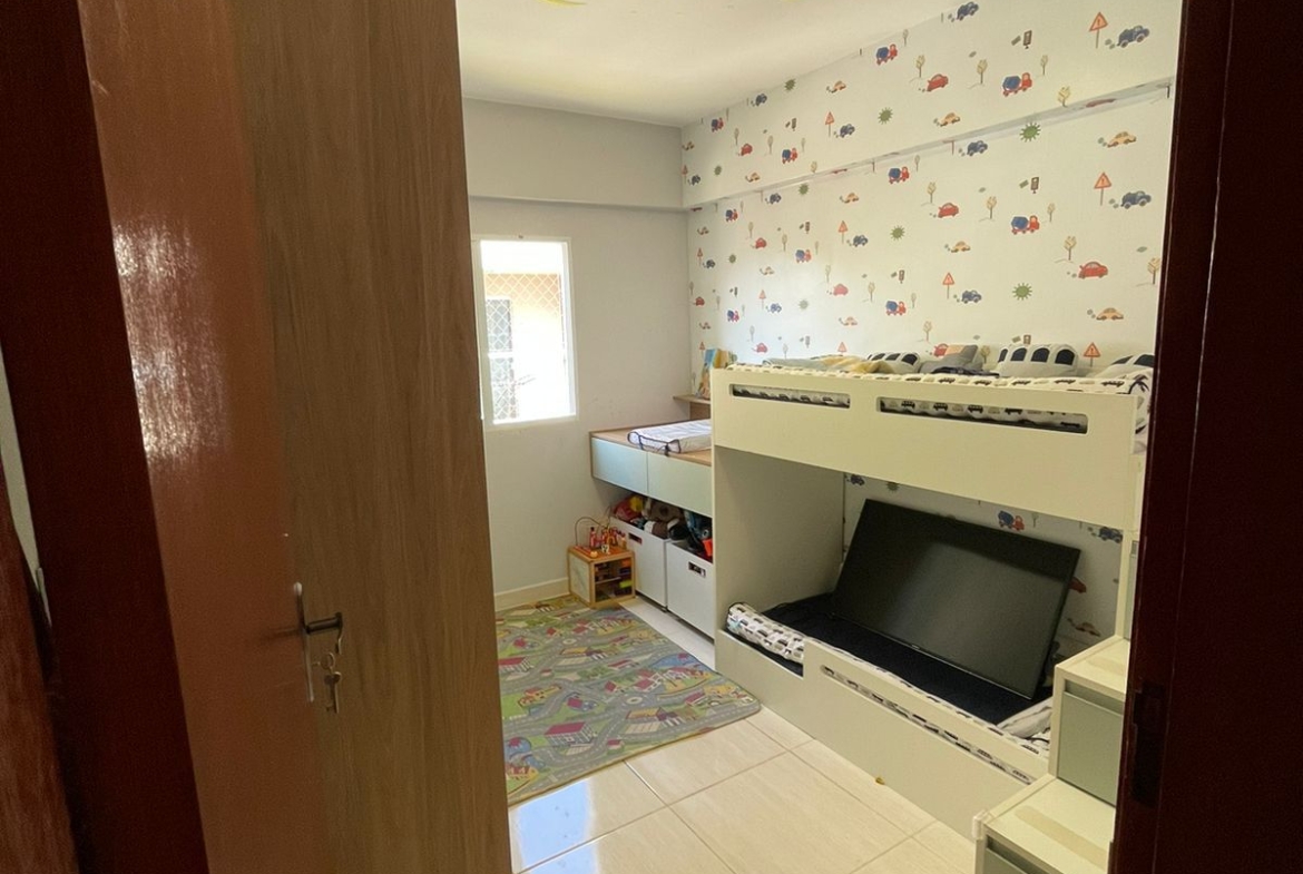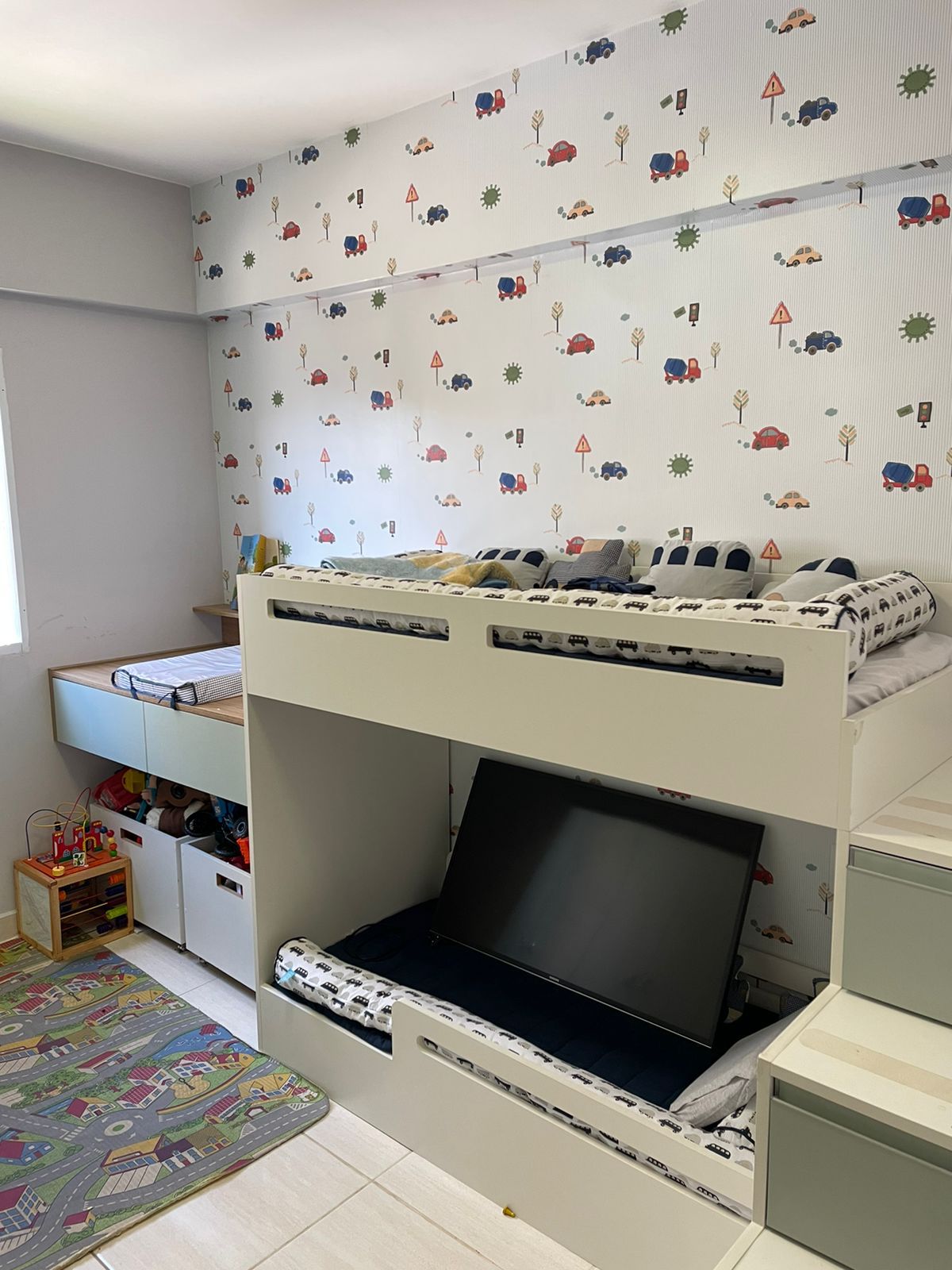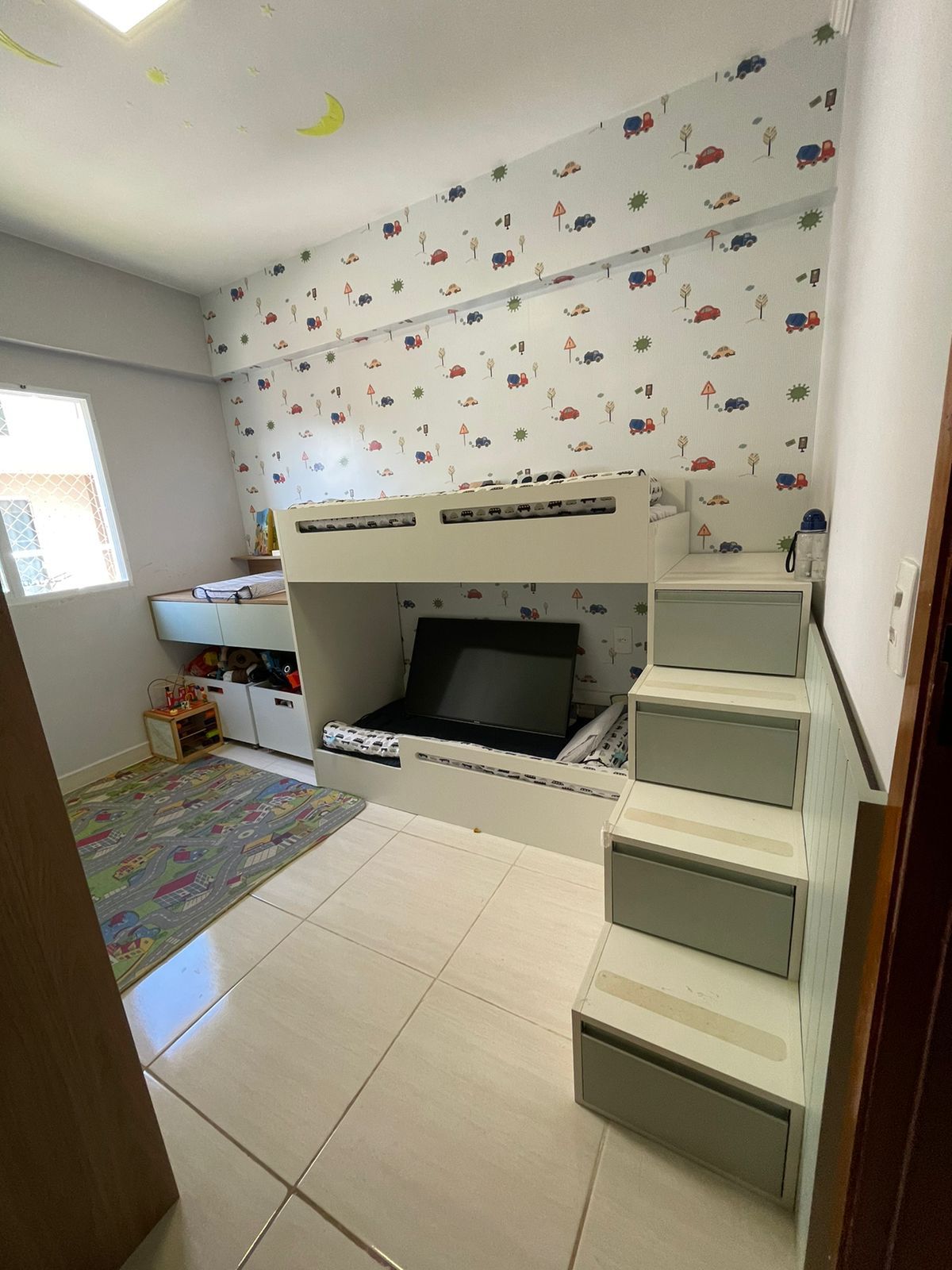 - Dormitório: Projetados com armários e painéis (quarto infantil com beliche planejado, trocador e papel de parede lúdico).