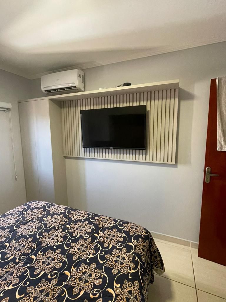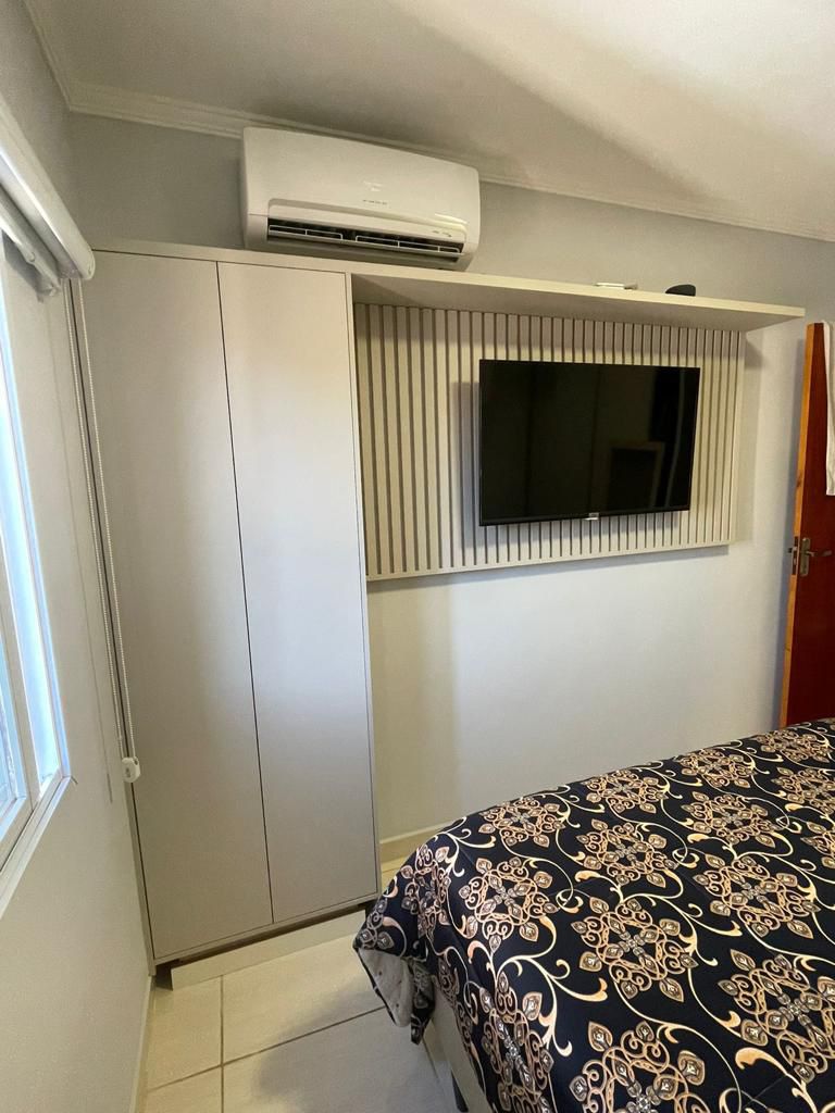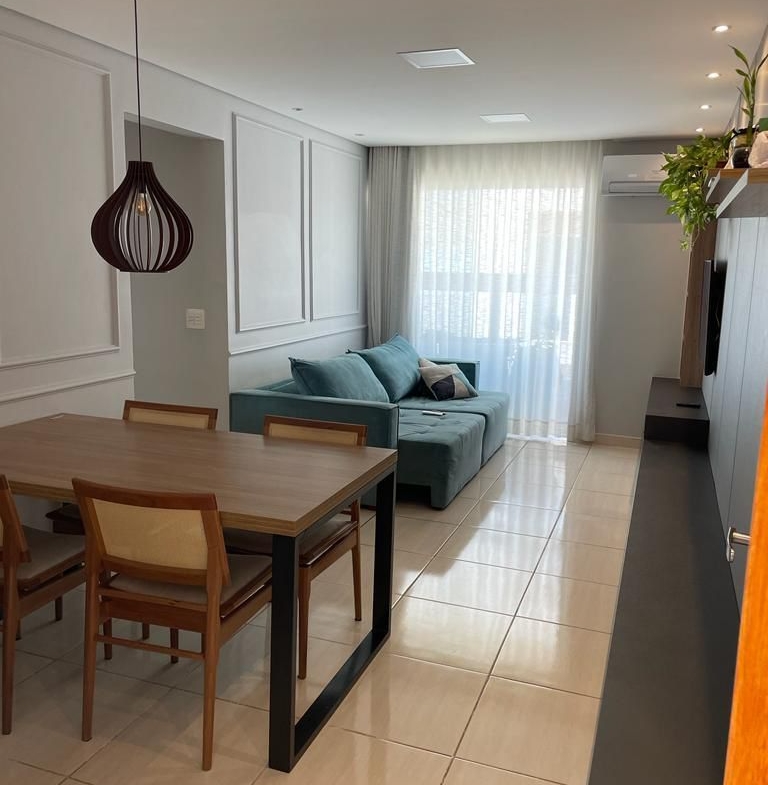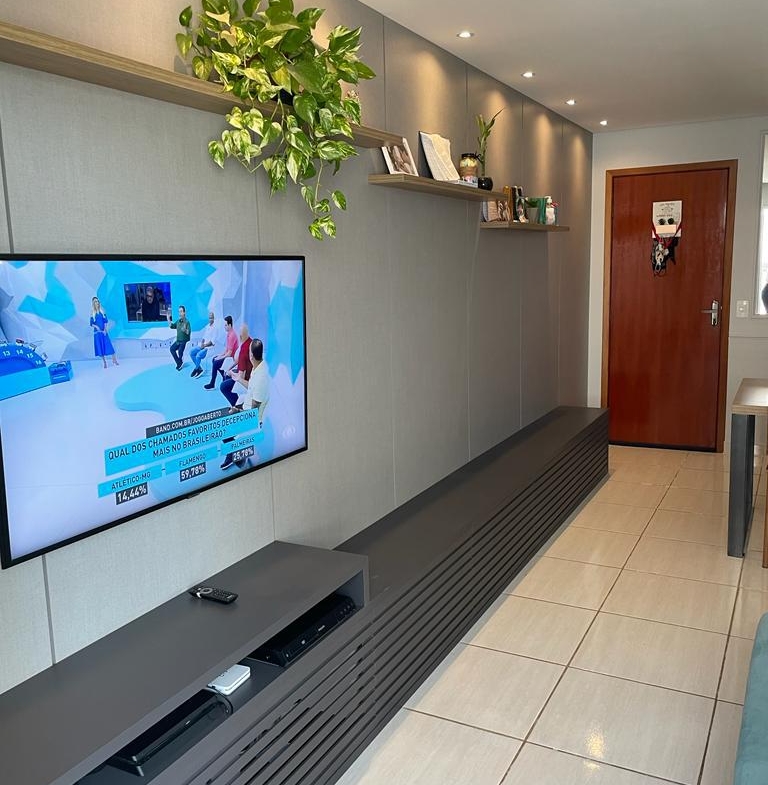 - Sala de Estar/Jantar Integrada: Ambientes modernos e harmoniosos com painéis ripados e molduras decorativas. Acompanha ar-condicionado (visível na foto).