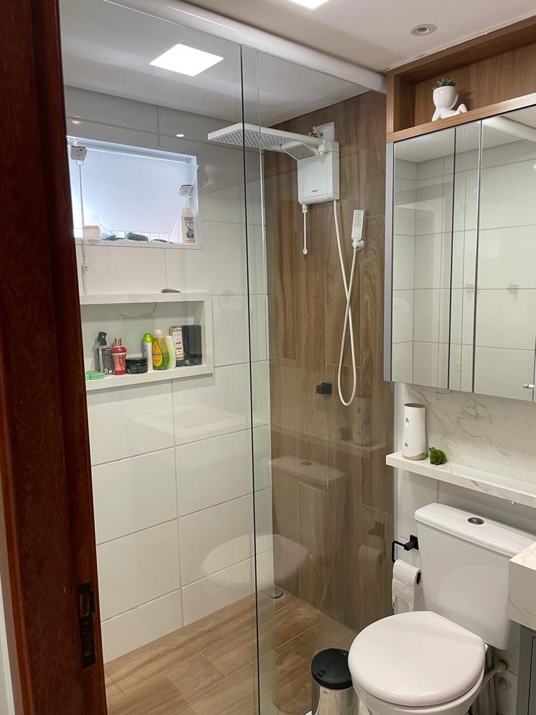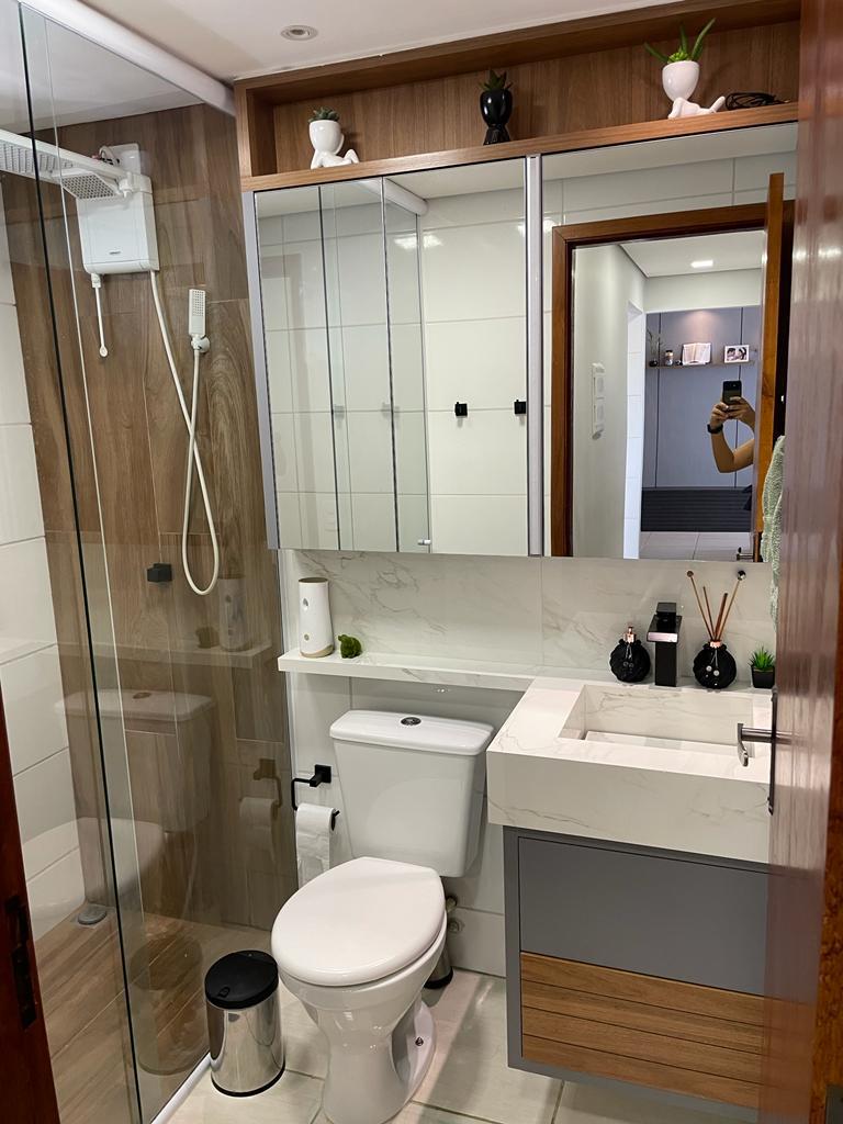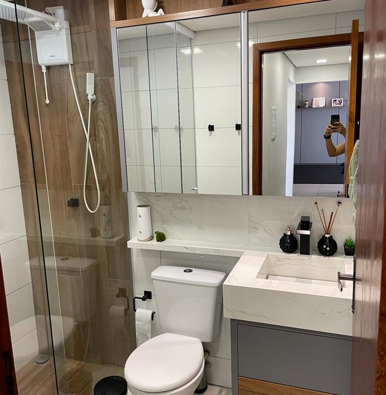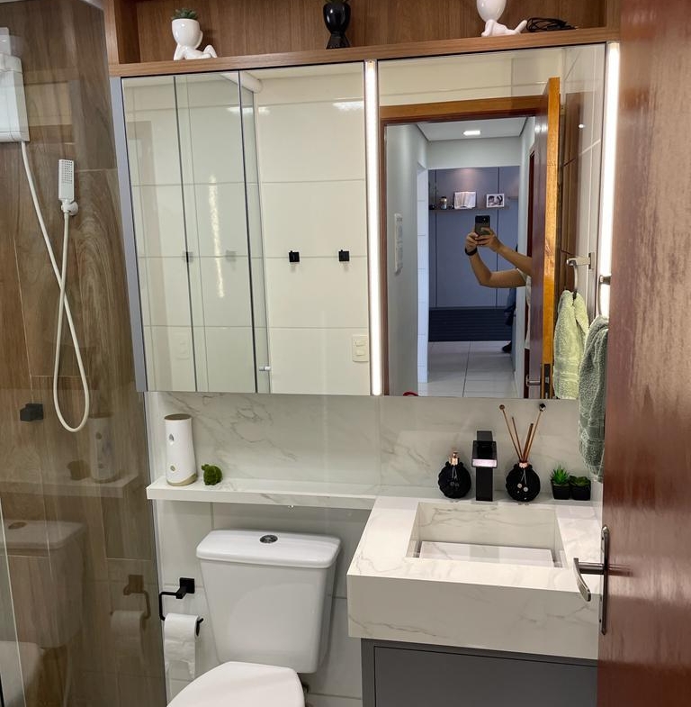- Banheiro Moderno: Box Blindex, nicho embutido, marcenaria com cuba sobreposta e espelheira com iluminação lateral.