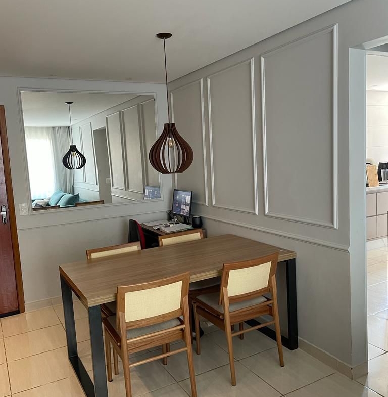 - Iluminação e Decoração: Teto com rebaixo em gesso e projeto de iluminação moderno (spots e pendente sobre a mesa de jantar).