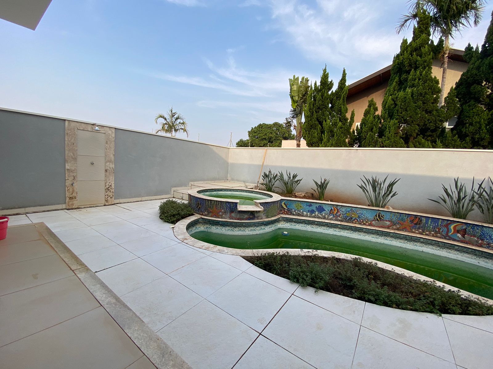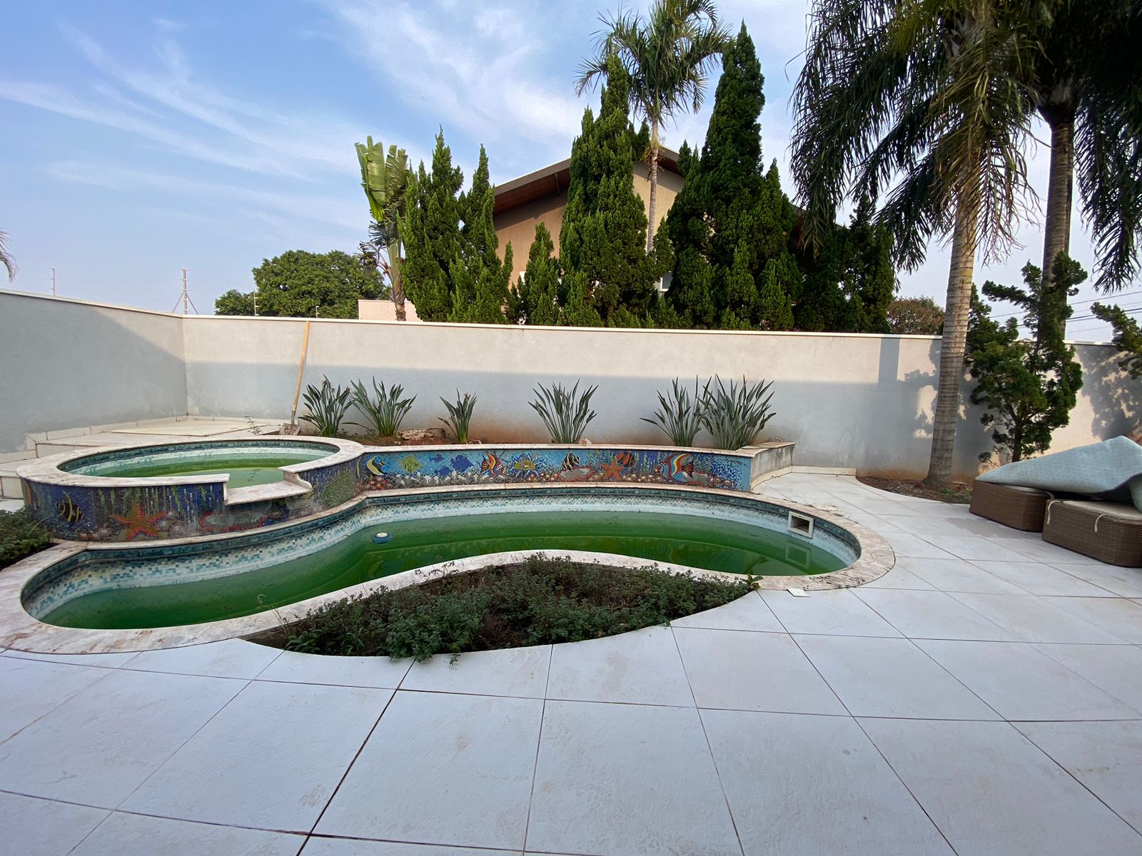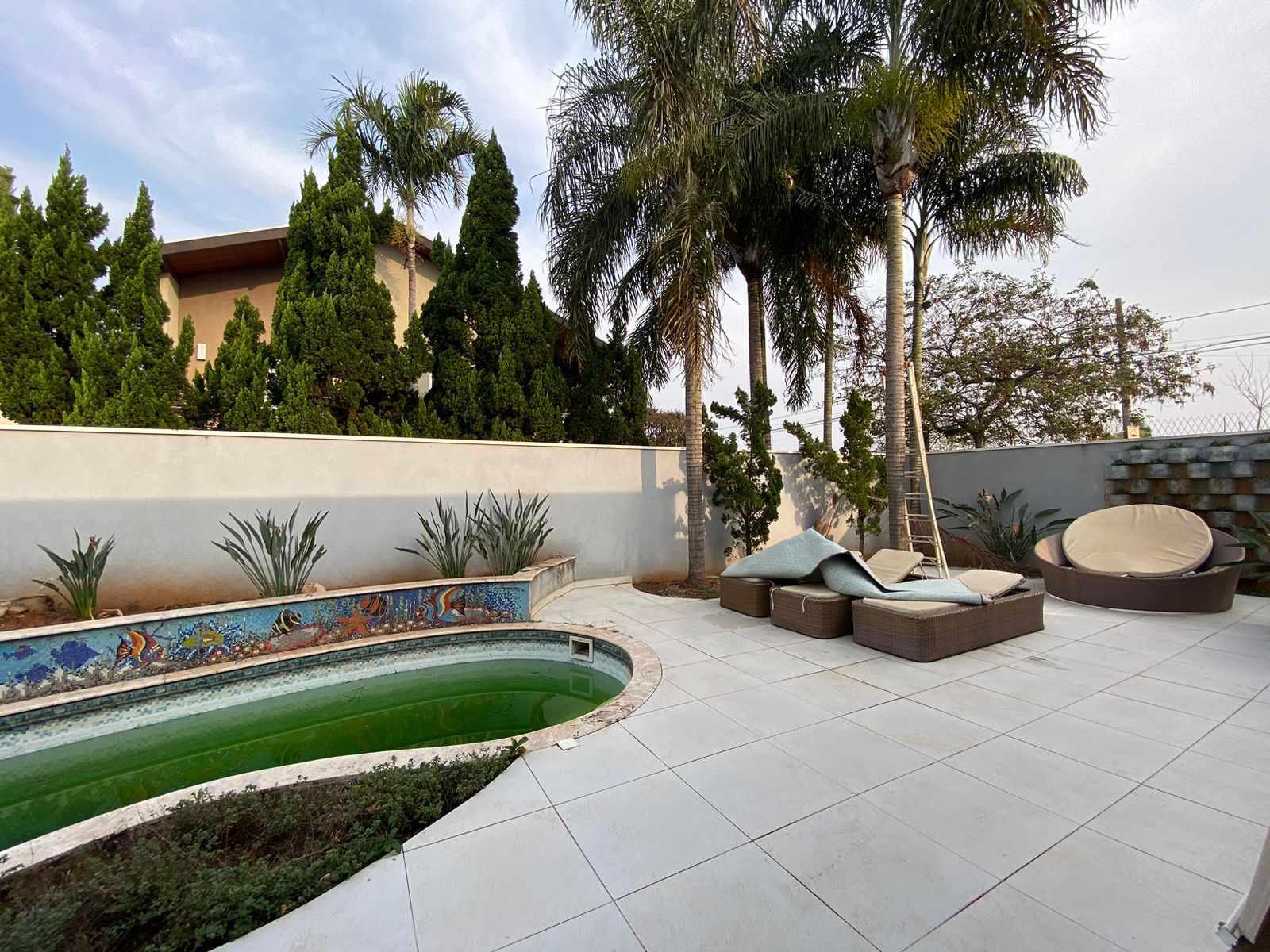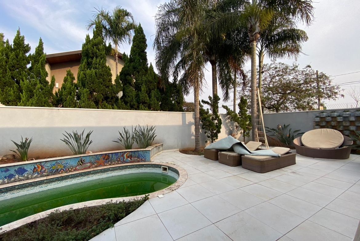 Piscina privativa cercada por um belo projeto de paisagismo.